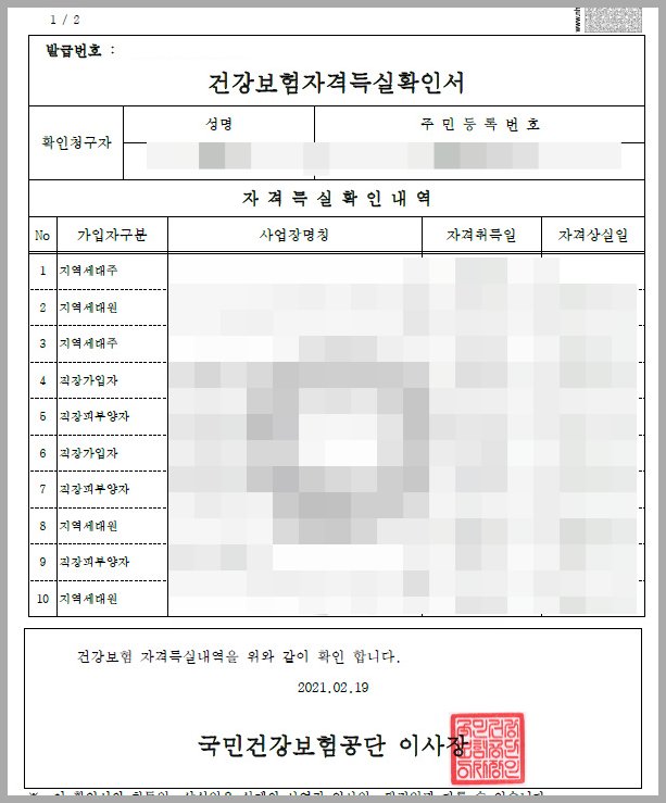 상단에 보건복지가족부에서 발급받은 국민건강보험 자격득실확인서가 보입니다. 파일은 즉시 열람 및 출력할 수 있습니다.발행된 확인서를 보면 건강보험 취득일, 상실일이 연도 순으로 등록되어 있었습니다. 자격상실일은 퇴사일이며 퇴사일이 따로 기재되어 있지 않으면 현재 해당 사업장에 근무 중이라고 보면 됩니다. 또 퇴사한 직후에는 퇴직수당이나 급여정산 등이 아직 이뤄지지 않아 건강보험 자격상실 신고가 되지 않았을 확률이 높습니다. 새로 취업한 경우 고용보험(4대보험)을 신고하면 자동으로 전산에 등록됩니다.마무리하면서직장 취업, 이직시에 필요한 경우 이외에도 이 국민 건강 보험 자격 득실 확인서가 사용되는 경우는 상당히 많지만 정부에서 지급하는 코로나 소상공인 손실 보상금과 자기 격리 생활 지원금 신청 때도 가족 구성원이 공무원이나 공공 기관 재직자인지를 확인하기 위해서 이 서류를 제출해야 했어요. 또 중소 기업청과 청년 전세 자금 대출시에도 현재 직장에 재직 중이 아니라 퇴직 상태이면 퇴근 증명서와 건강 보험 자격 득실 확인서가 필요합니다. (퇴사 증명서에는 사업자 번호와 회사명, 회사의 직인이 필수로 들어가야 한다)일반적으로는 은행 신규 계좌 개설 시에도 소득 증명이 없으면 한도 제한 계좌로 개설되기 때문에 한도 제한을 푸는 증빙 서류로 건강 보험 자격 득실 확인서 제출을 많이 합니다. 어쩌면 가장 쉽게 발급/제출이 가능한 일종의 자격증이기 때문입니다^^발행 방법이 아주 간단하고 가볍게 정리하였지만 건강 보험에 가입되어 있는 근로자들에게 유용한 도움이 된 것을 바라면서 포스팅을 마치겠습니다~그 외의 구체적인 문의는 언제든지 논평을 통해서 남기세요!