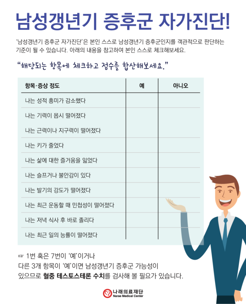 ▲ 남성 갱년기 자가진단 [남성 갱년기 증상과 치료방법] 안녕하세요! 자상한 수영 씨입니다.