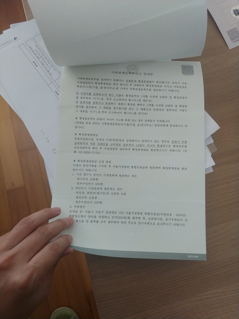 저희가 서울가정법원(서초구)에 입양아 입양신청을 위해 우송한 편지입니다.확인하실 수 있습니다.