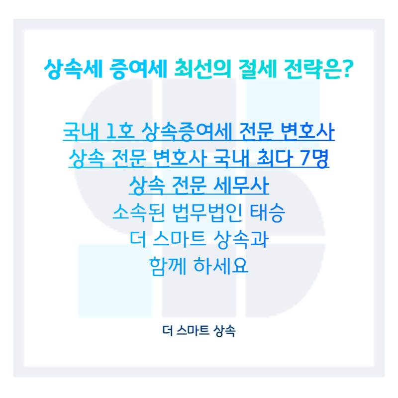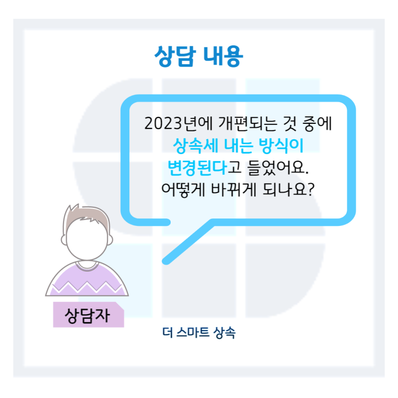 상담 내용 “2023년 개편으로 상속세 납부 방식이 바뀐다고 들었다. 어떻게 바뀔까?” 한국의 상속세는 70년 넘게 바뀌지 않고, 상속세는 다른 방식으로 징수된다. 올해 2023년부터. 어떻게 변할까요? 변경된 접근 방식에서 유산세를 납부하려면 어떤 전략이 필요합니까? 상속전문가이자 증여세 전문 변호사 이우리 변호사와 법무법인 태승 더스마트상속 국내 최대 상속세 전문 변호사이자 세무사가 알려드립니다. 나는 당신에게 준다.2023년 상속세 재산취득세법에 관한 상속변호사 자문