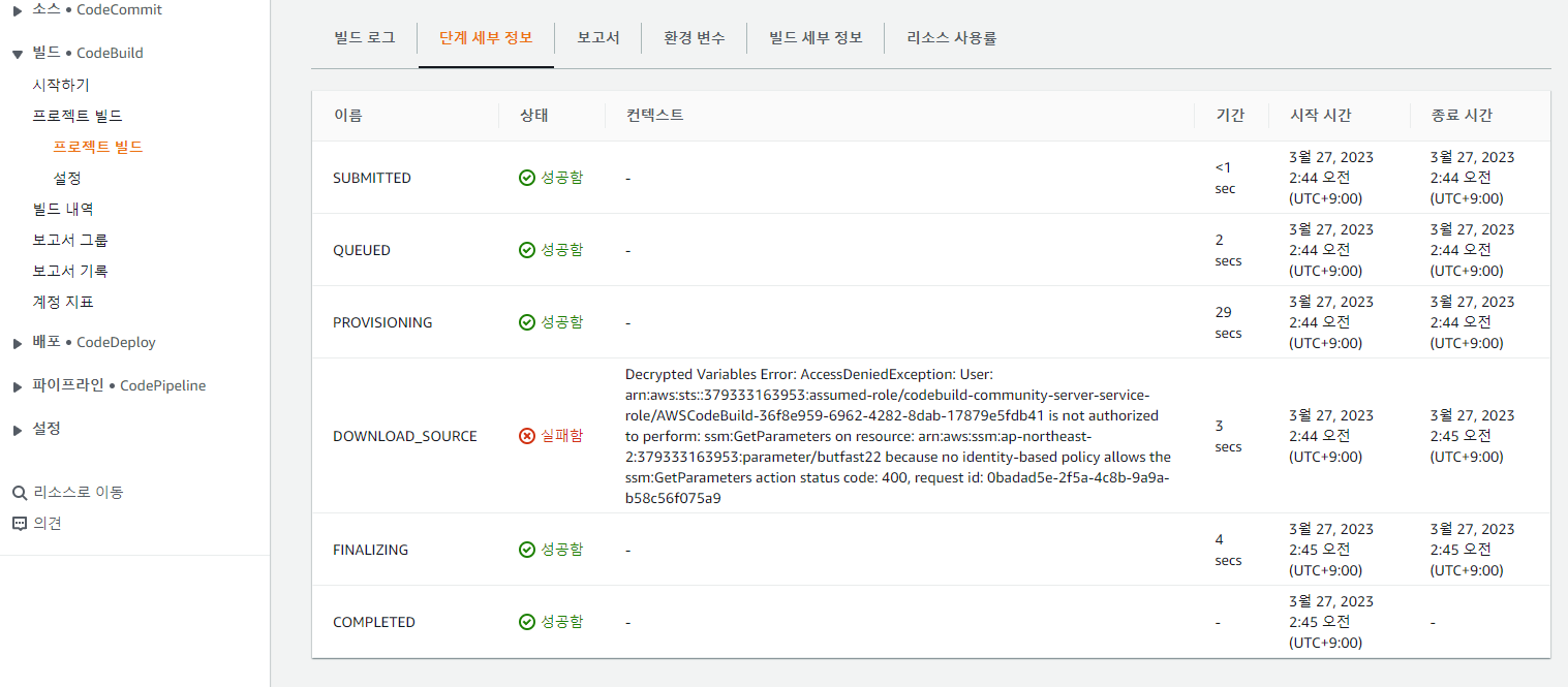 AWS에서 파이프라인을 통해 배포를 자동화하려고 하지만 Build에서 DOWNLOAD_SOURCE 프로세스 중에 다음 오류가 발생했습니다.